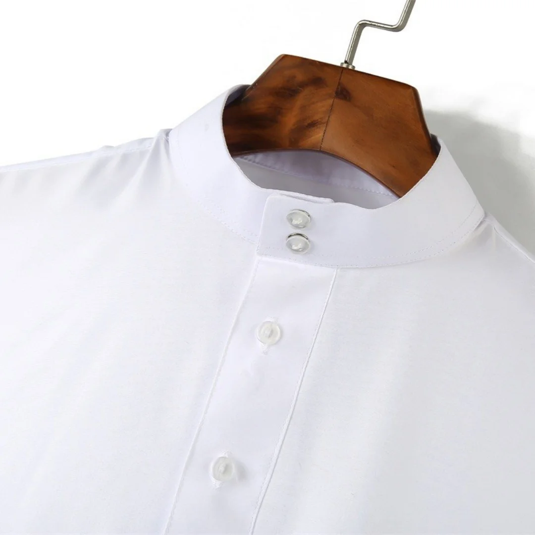 Conçu avec des manches longues et un col mao (col officier), ce qamis homme offre une coupe longue et fluide qui garantit liberté de mouvement et confort pendant toute la journée. Son tissu léger et respirant le rend idéal pour les climats chauds et pour un usage quotidien.